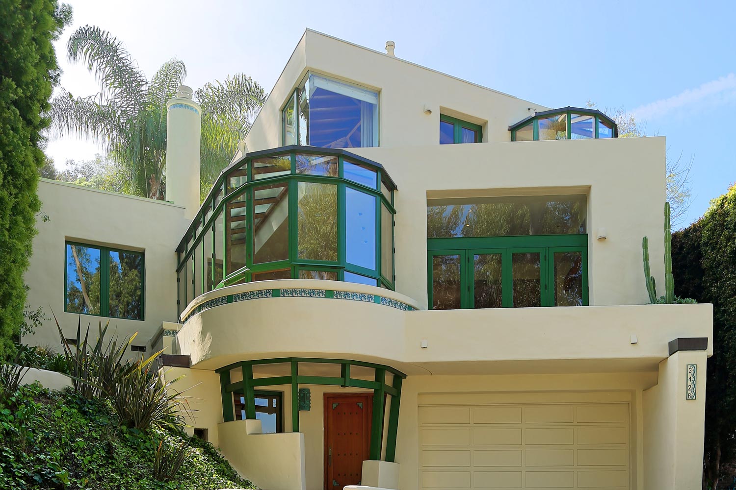 A uniquely designed custom home that features a main entrance with dramatic curved floating wood staircase surrounded by wood-framed glass windows. The living room is expansive, light and bright surrounded by glass and wood beams. There is a sense of serenity and privacy provided by tall trees around the front of the house.